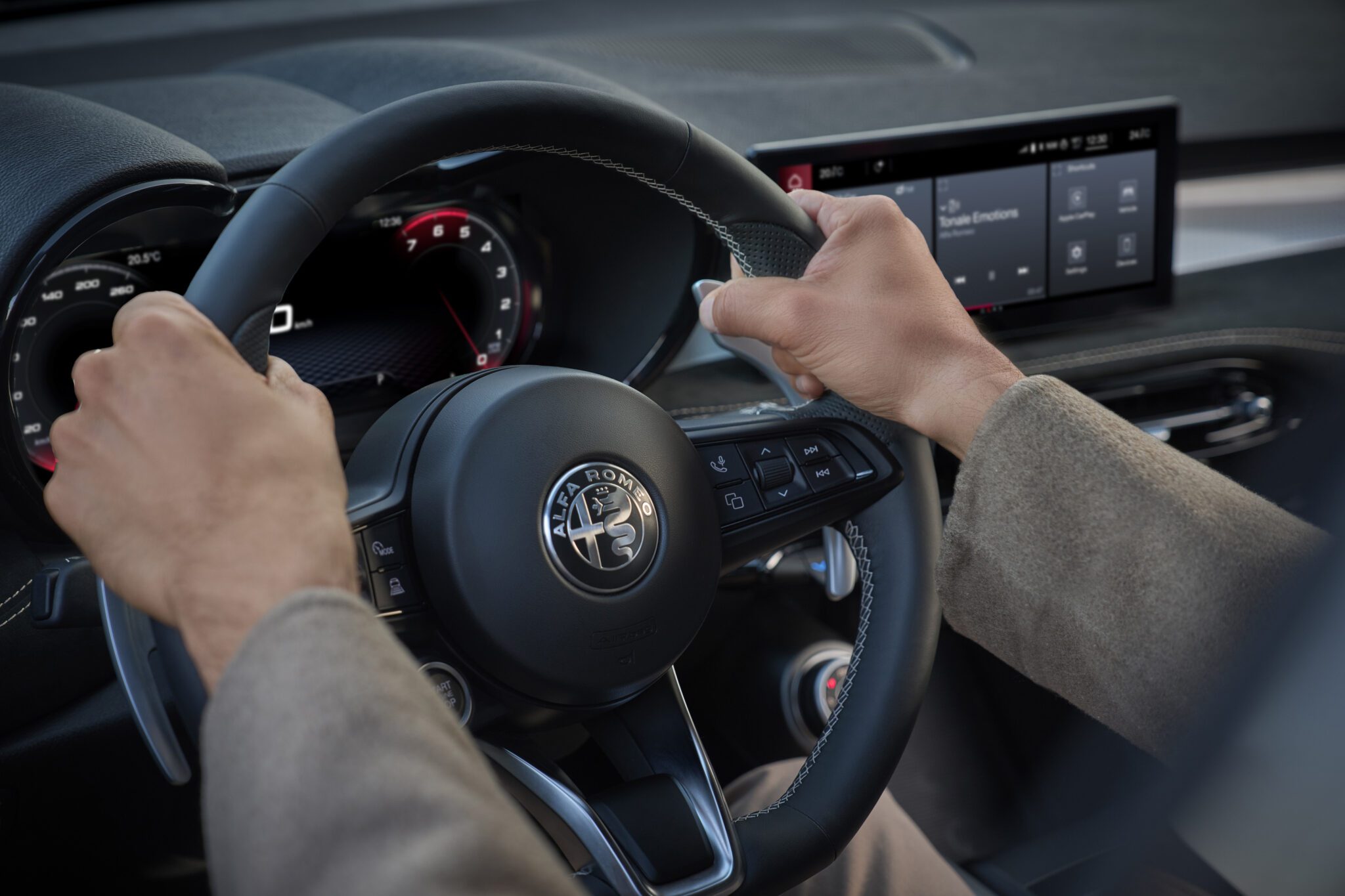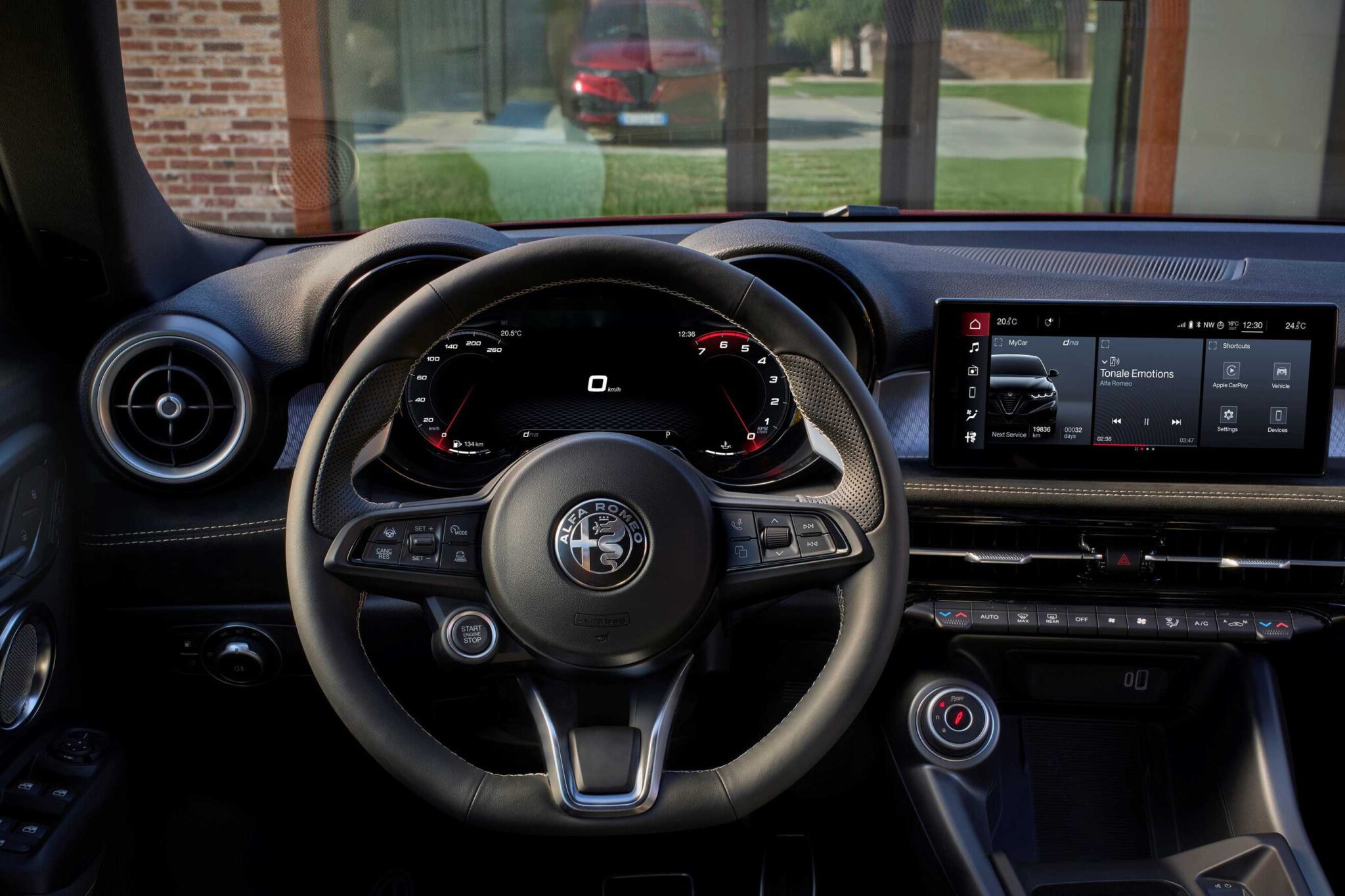 Staring upfront, the concave scudetto grille, inspired by the limited-run 33 Stradale supercar, is a clear nod to Alfa’s heritage, making the Tonale appear wider. The overhang has been shortened, and both front and rear tracks are broader, giving it a more purposeful stance. New 20-inch, three-hole wheels on the Sport Speciale trim recall Alfa’s iconic “telephone dial” design, while Brembo calipers in gloss black hint at capability beneath the refreshed styling. New colors include classic shades like Rosso Brera, Verde Monza, and Giallo Ocra.