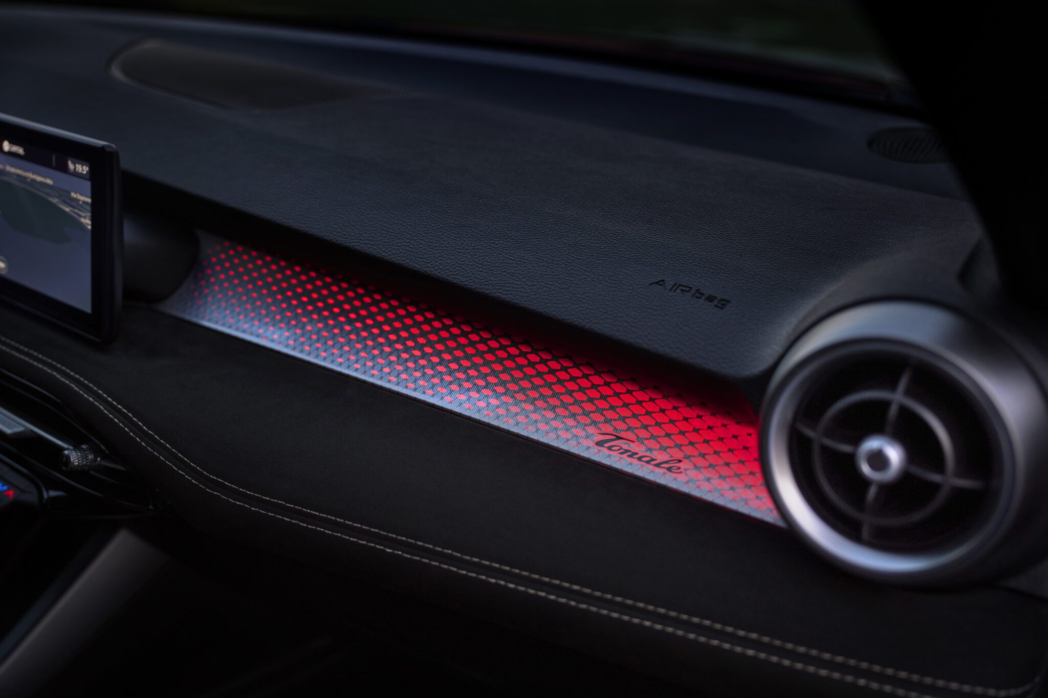 Inside, the updates lean towards sporty with a new red leather option, now available for the first time, alongside black. The Sport Speciale trim introduces Alcantara-trimmed seats with white stitching. The Dash, door panels, and armrest all carry contrasting stitching to tie everything together. Features like eight-way power front seats with ventilation and heating, and a subtle layer of ambient lighting that lifts the overall cabin.