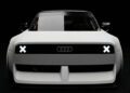 A futuristic white Audi concept car with a boxy design, black roof, and minimalist LED lights is displayed against a red background. This '80s Retro-inspired Audi Design Study is actually an RS3 underneath.