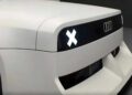 Close-up of the rear of a white concept Audi RS3 featuring illuminated red X-shaped tail lights and a black horizontal panel with the Audi logo, showcasing Retro-inspired Audi Design elements.