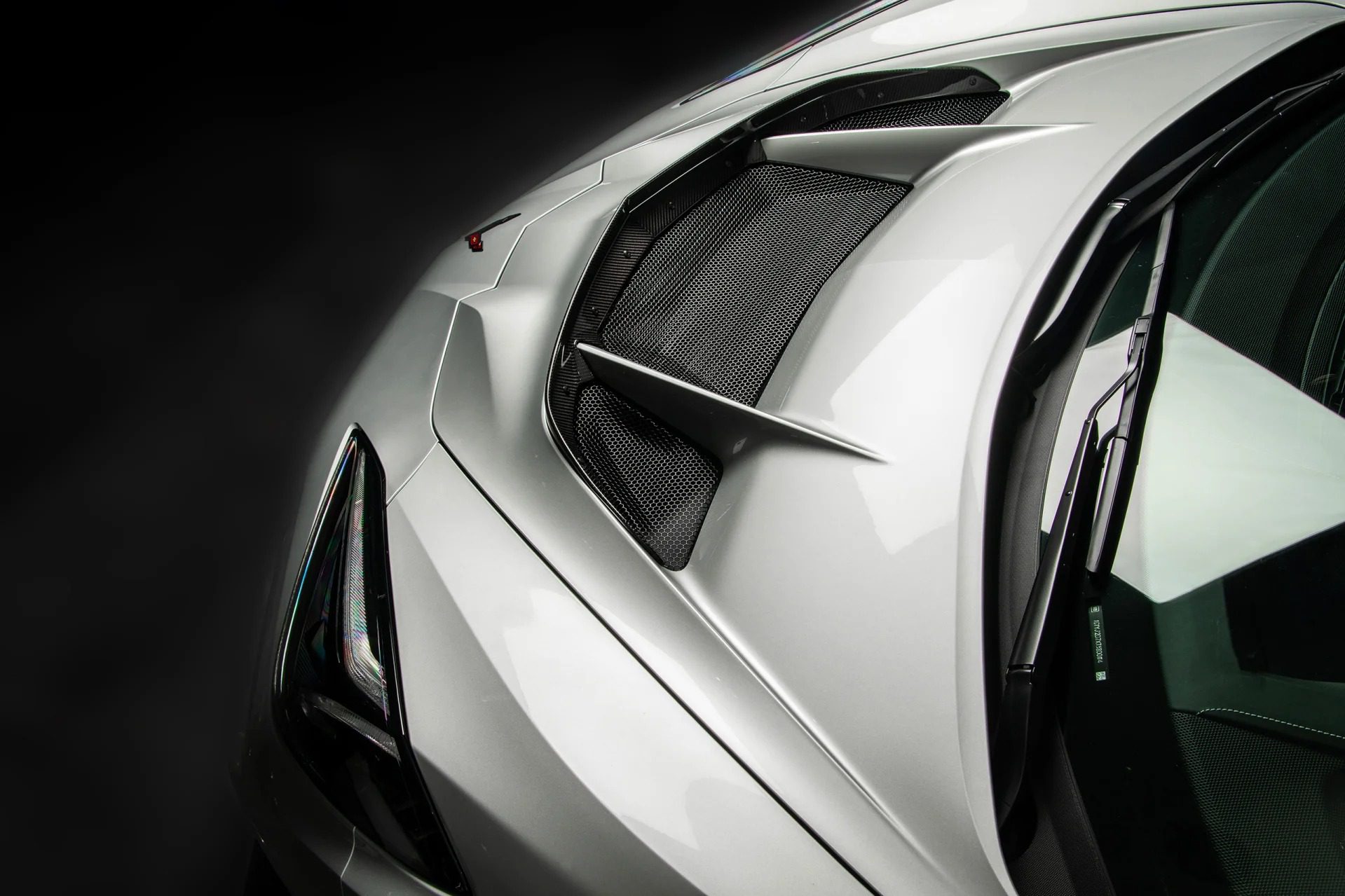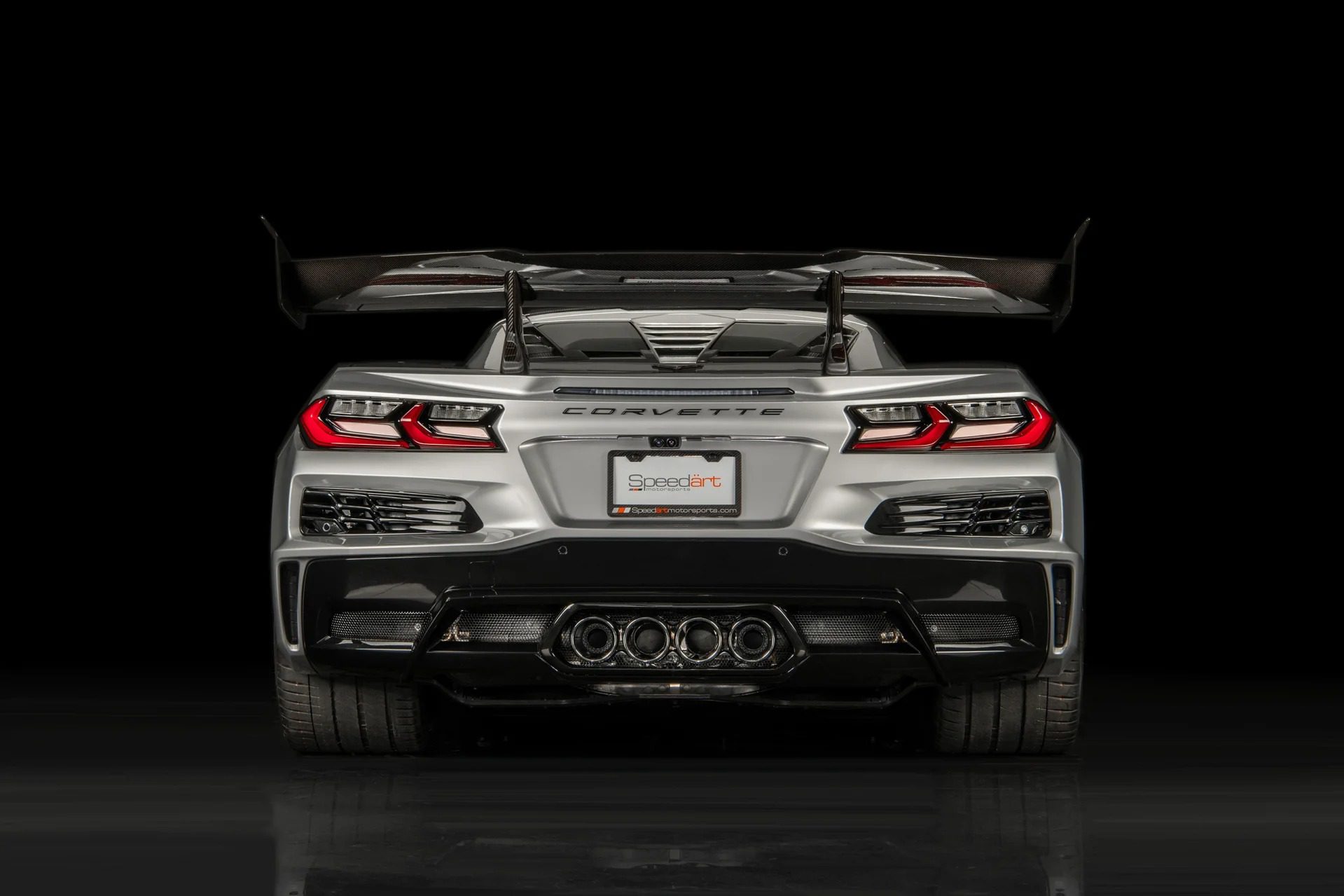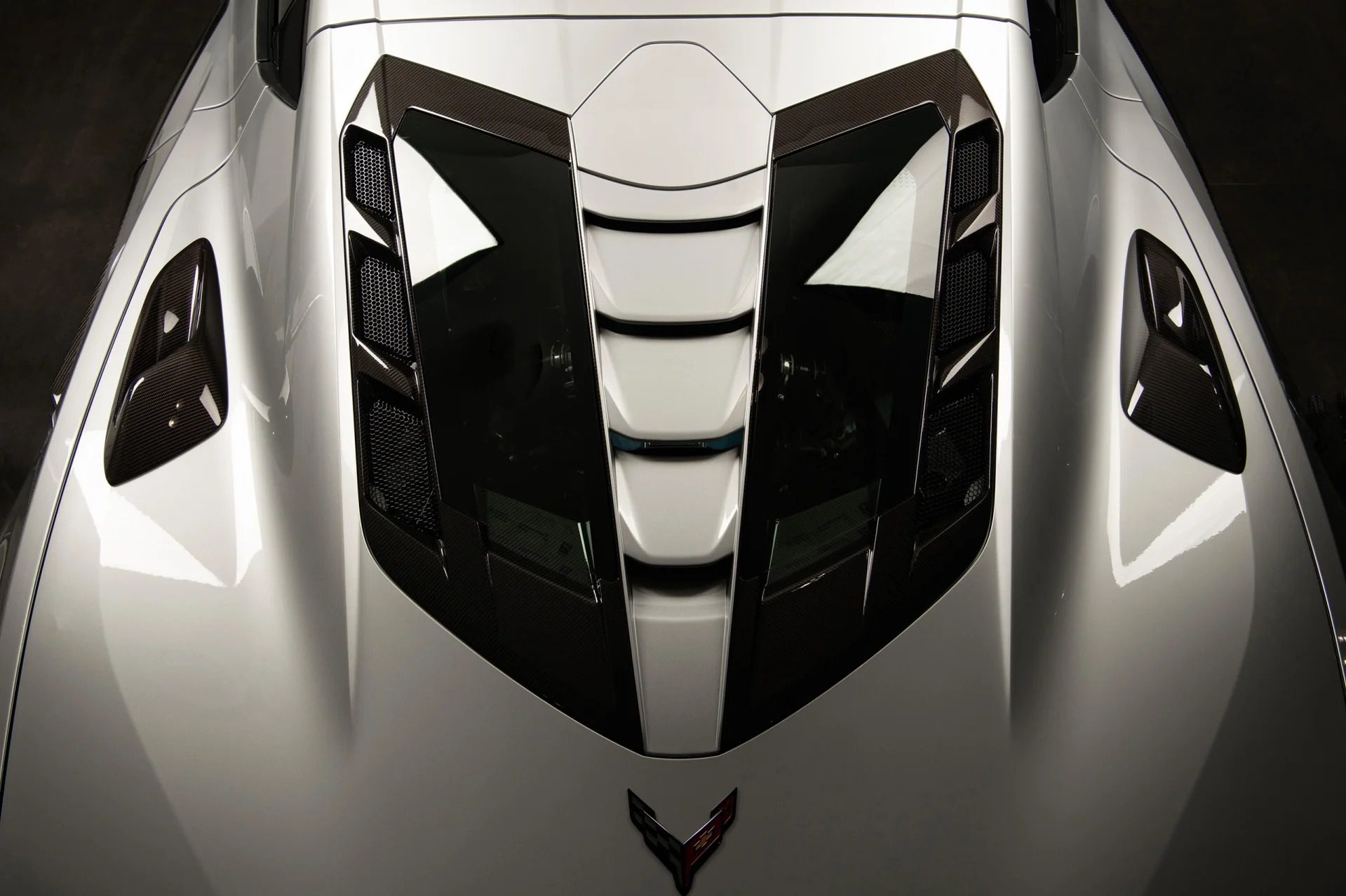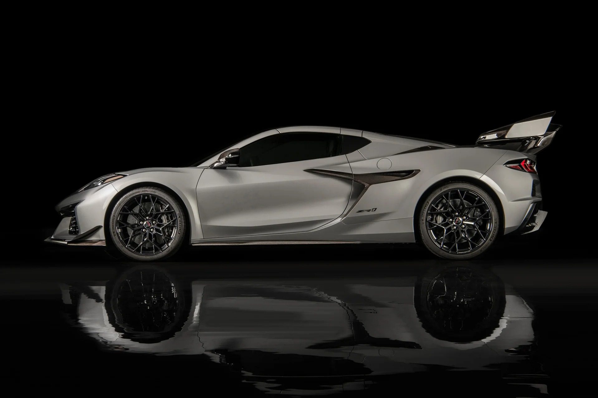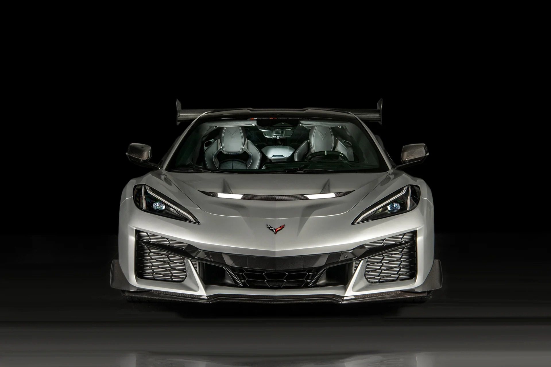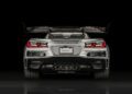 Extra lightweight touches and aero-focused areas on the car subtly differentiate it from its Z06 counterpart, utilizing massive air ducts and louvres to help channel air for cooling and downforce at high speeds. Equipped with the 3LZ Package, it has a list of exterior upgrades, including exclusive two-tone paint options, carbon-fiber accents, and lightweight forged wheels. The most notable characteristic of the ZR1 is its massive fixed carbon rear wing that comes with the ZR1 Carbon Fiber Aero Package, generating over 1,200 lbs of downforce.