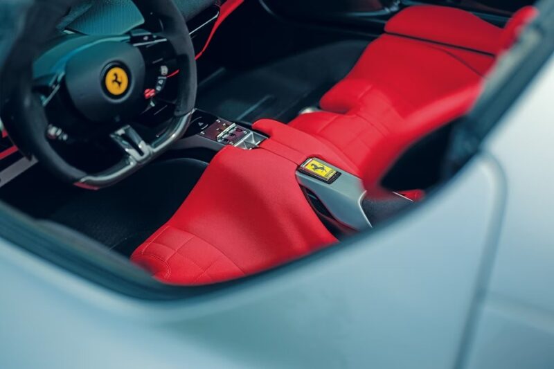 That connection reached its apex in 2022, when the friends, along with their families, traveled to Ferrari’s Tailor Made offices on Park Avenue in New York to configure custom Daytona SP3s. Tailor Made, Ferrari’s bespoke program, pairs clients with experts who guide the creation of each car, guaranteeing every choice, from exterior shades to interior stitching, reflects a blend of personal taste and Ferrari’s relentless design DNA. Bernier’s wife and daughter chose a striking Glossy Sanusilver for his SP3, with subtle Rosso F1 2004 accents and red technical-fabric seats evoking the legendary 250 GTO 4153GT. Garner and his wife went bolder with Blu Elettrico, complemented by Alluminio Lucido and Rosso Fiorano accents, which visually connected to Garner’s Monza SP2. What might have been a transactional process instead became an immersive, creative configuration experience, concluded by a private dinner with family, Ferrari representatives, and top Italian wines.