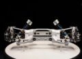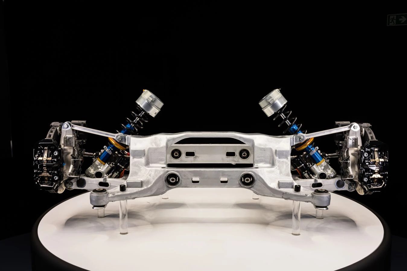 That low-slung balance comes from the battery’s full integration into the chassis. Ferrari has actually designed it as a structural element, not a separate slab as in most high-performance EVs, using die-cast compression plates that also serve as mounting points. 15 modules house 210 high-density cells (305 Wh/kg, 159 Ah), arranged for minimal inertia and maximum safety. A single fuse can isolate 2,000 A in three milliseconds if something goes wrong. You can even remove and service the battery on a carrier-proof Ferrari. Another significant development is Ferrari’s first-ever rear sub-frame.