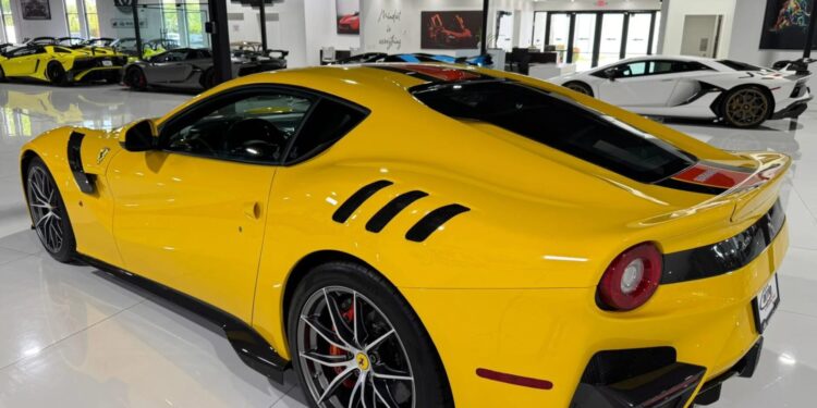 Inside, the F12tdf is equally mesmerizing, with a driver-focused cockpit that blends luxury with purpose. Alcantara, carbon fiber, and aluminum are the materials of choice, providing a tactile environment that complements the exterior’s aerodynamic finesse. At its heart, the F12tdf boasts a 6.3-liter V12 engine, a powerhouse that catapults it from 0 to 60 mph in a breathtaking 2.9 seconds, reaching a top speed of over 211 mph. With 769 horsepower and 520 lb-ft of torque delivered through a seven-speed dual-clutch transmission, this prancing horse offers a driving experience that’s both visceral and refined.
