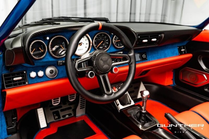 Inside the Gunther Werks Speedster, the cabin continues its weight-saving focus with an entirely exposed carbon tub, highlighted by more satin-finished aluminum trim that subtly elevates the interior. A vibrant mix of Kobalt Blue, Prima Nappa Poppy Leather, and alcantara adds an intense pop of color to the already-inviting cabin. And instead of fitting this modern interpretation with huge screens and high-tech, Gunther Werks keeps the interior of its builds calm, cool, and collected, just as the Porsches they began life as.
