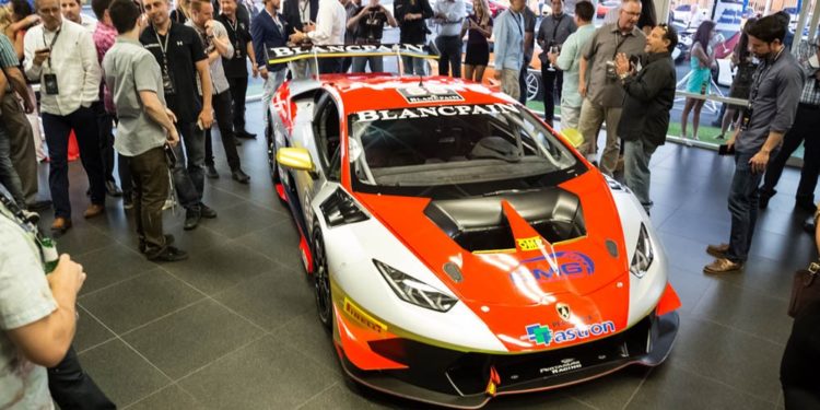 Photos of the Aug. 7 event show a crowd surrounded by Lamborghinis, McLarens, Porsches and Ferraris enjoying some beverages, having light conversations and browsing the selection of Blancpain watches on display. A few took advantage of the virtual racing simulator, then all gathered around the cloaked Super Trofeo for its official unveiling.