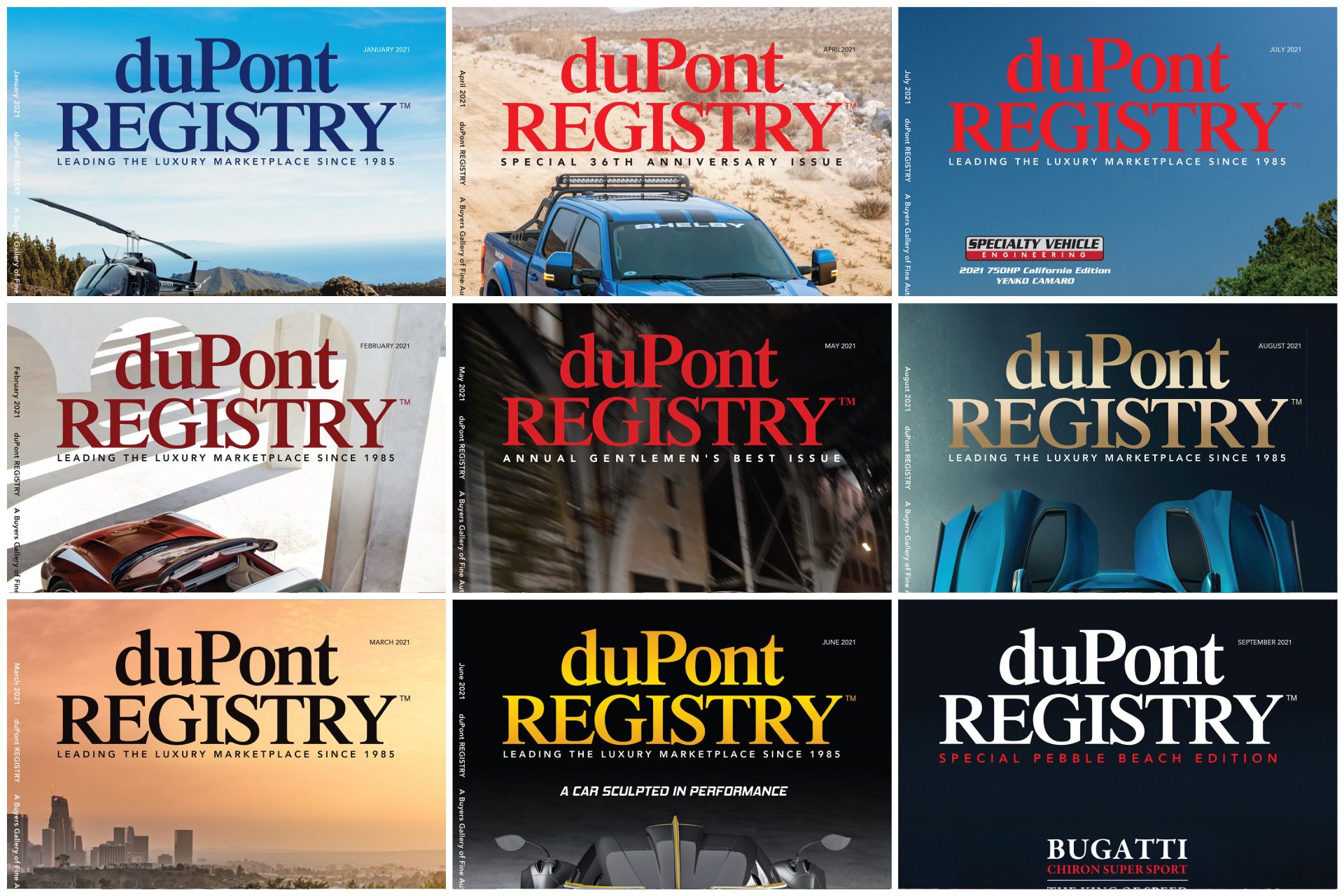 Looking back at duPont REGISTRY’s cover cars from the year 2021, recent memory shows some moments in automotive history that will undoubtedly soon be remembered as iconic and impactful. Take a trip down memory lane and look at our 2021 magazine covers below, and continue to celebrate our milestone anniversary by buying a copy of our special 40th anniversary edition magazine.