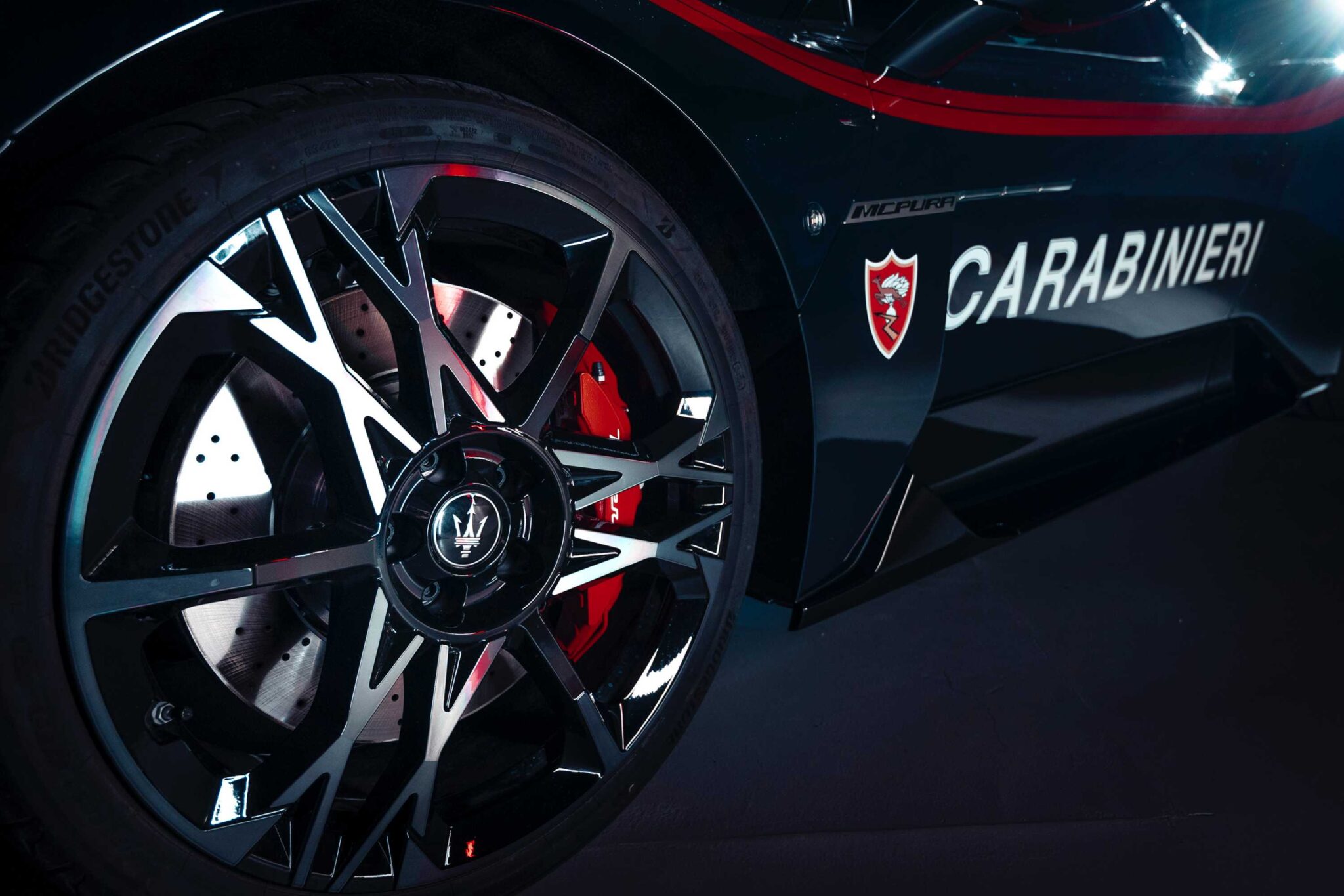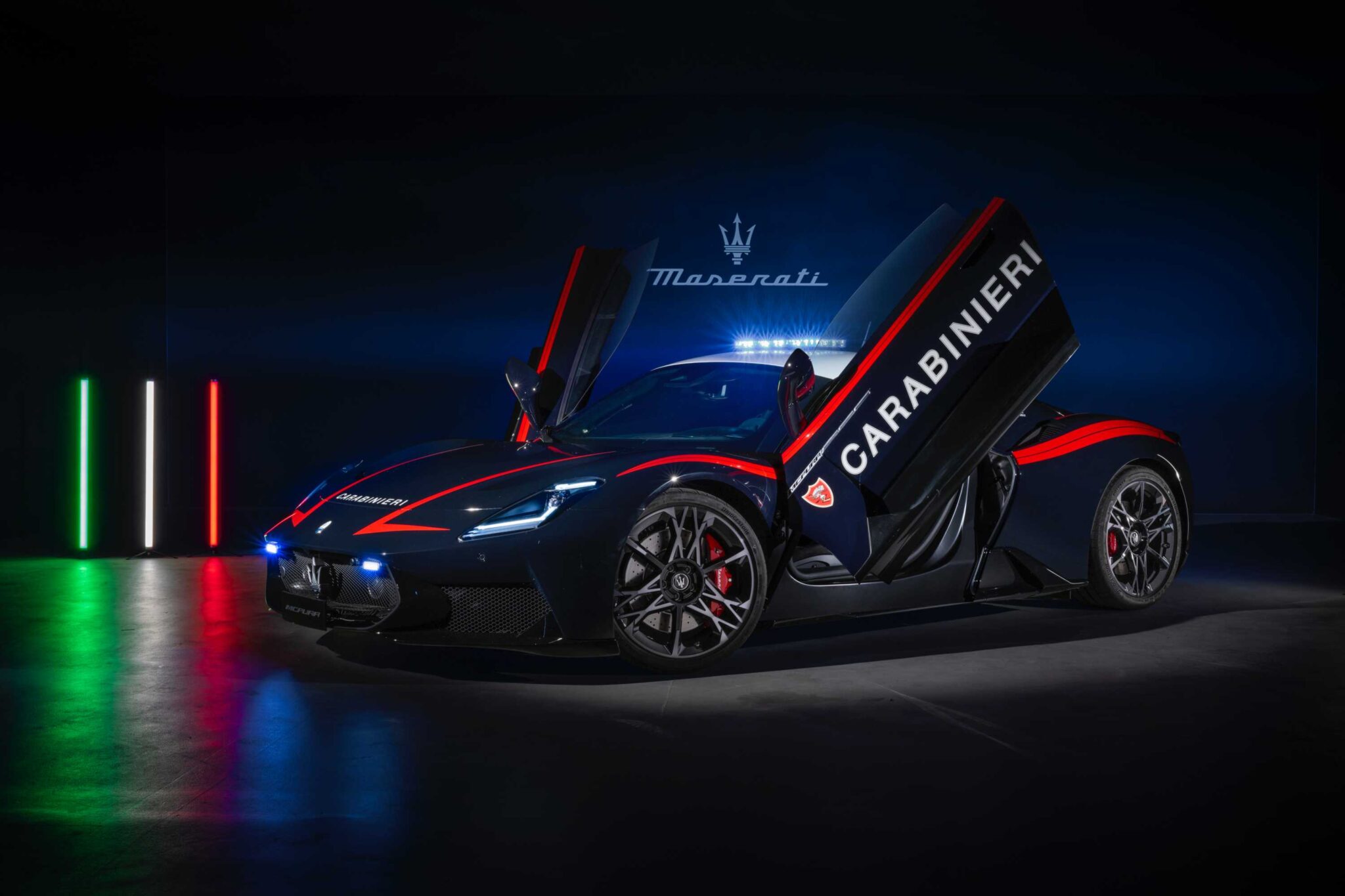 Developed by Maserati Centro Stile in Modena and finished in the Carabinieri livery, this car packs a twin-turbo 3.0-liter V6 Nettuno engine that delivers 630-horsepower. It’s the same powerplant used in the MC20 supercar and one that we recently had the chance to savor in the McPura Cielo. Built on a carbon-fiber monocoque, it keeps the weight low at around ~3,300 pounds, while maintaining rigidity, ideal for high-stress maneuvers needed in emergencies.