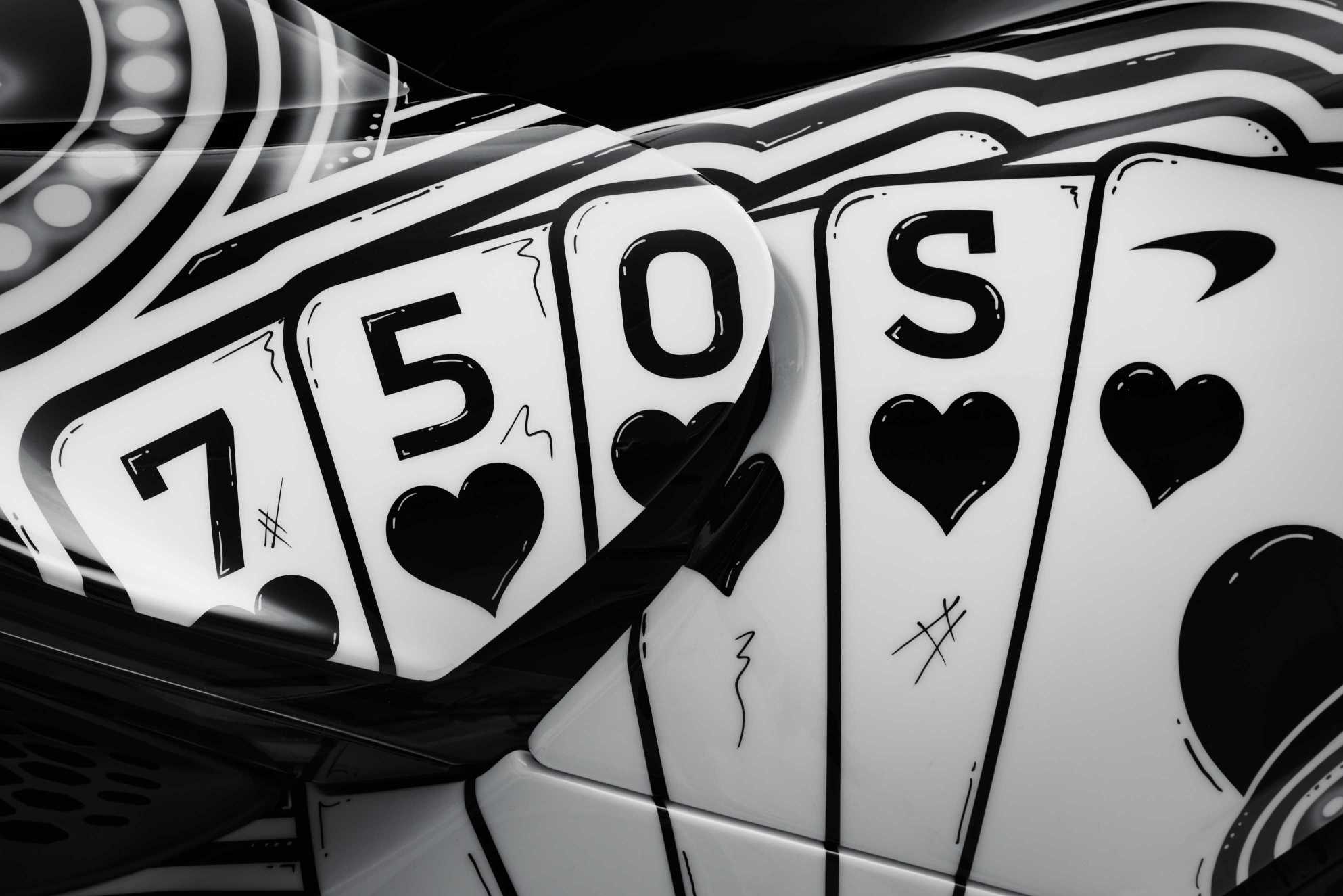 Black and white illustration of playing cards—7, 5, 0, S, and a blank—all with heart symbols, printed on a glossy curved surface. Inspired by Project Viva Revealed: One-of-One McLaren 750S Spider Brings Las Vegas to Life.