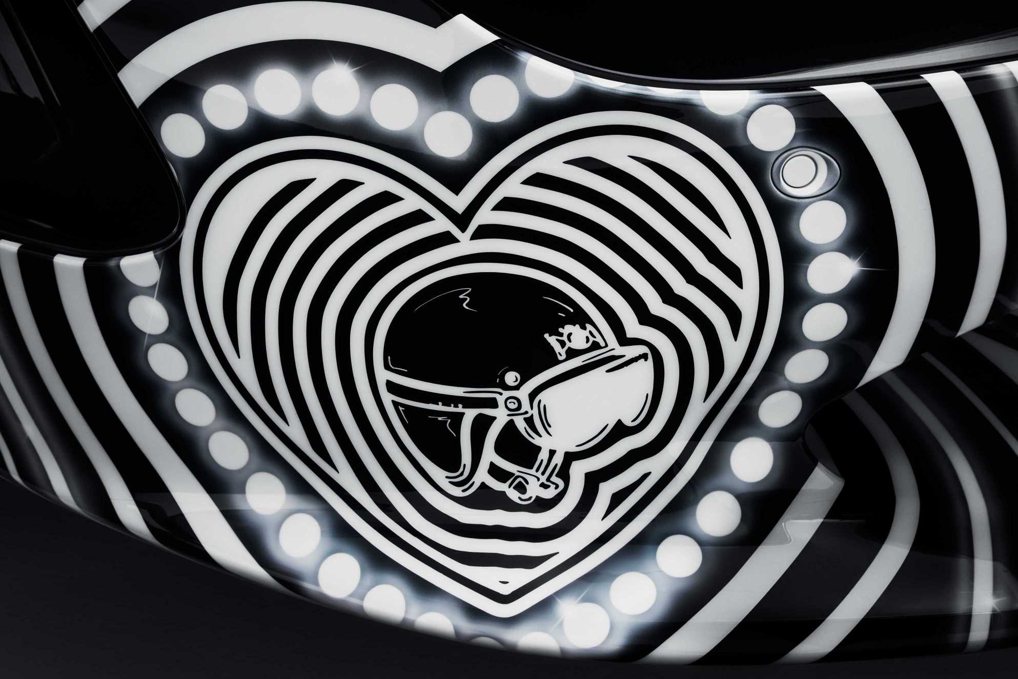 Black and white art featuring a striped heart shape and a helmeted figure inside, surrounded by a ring of circular lights—evoking the bold spirit of Project Viva Revealed: One-of-One McLaren 750S Spider Brings Las Vegas to Life.