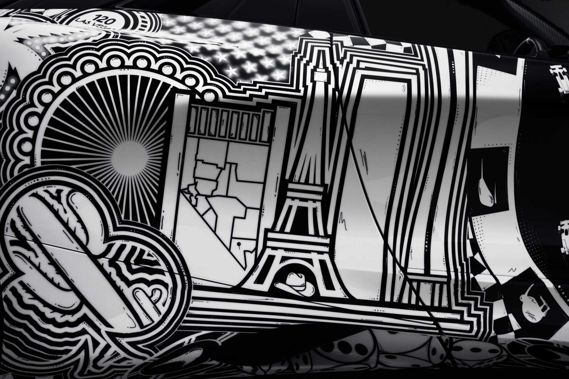 Close-up of a car with black and white abstract artwork, featuring geometric shapes, stripes, and a stylized Eiffel Tower—Project Viva Revealed: One-of-One McLaren 750S Spider Brings Las Vegas to Life among other graphic elements.