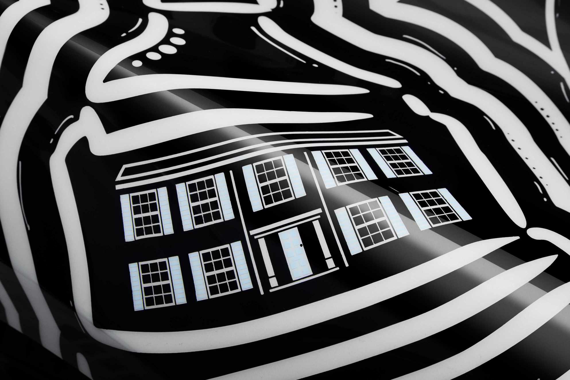 Black and white abstract illustration featuring a two-story house with columns and multiple windows, surrounded by wavy lines, inspired by the flair of Project Viva Revealed: One-of-One McLaren 750S Spider Brings Las Vegas to Life.