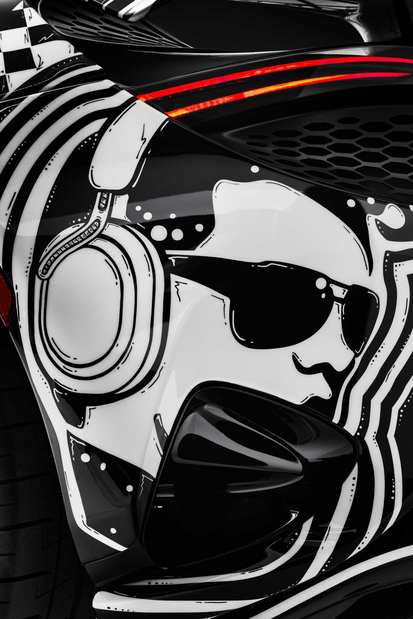 Close-up of a car with a black and white graphic featuring a person wearing headphones and sunglasses, red tail lights, and tire tread—Project Viva Revealed: One-of-One McLaren 750S Spider Brings Las Vegas to Life.