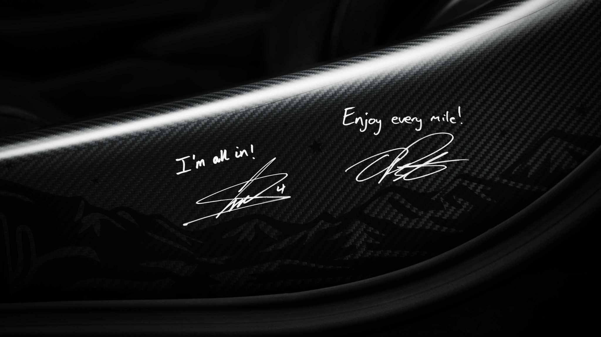 Close-up of a black carbon fiber surface on the Project Viva Revealed: One-of-One McLaren 750S Spider, featuring white handwritten signatures and messages like "I'm all in!" and "Enjoy every mile!" that bring Las Vegas to life.