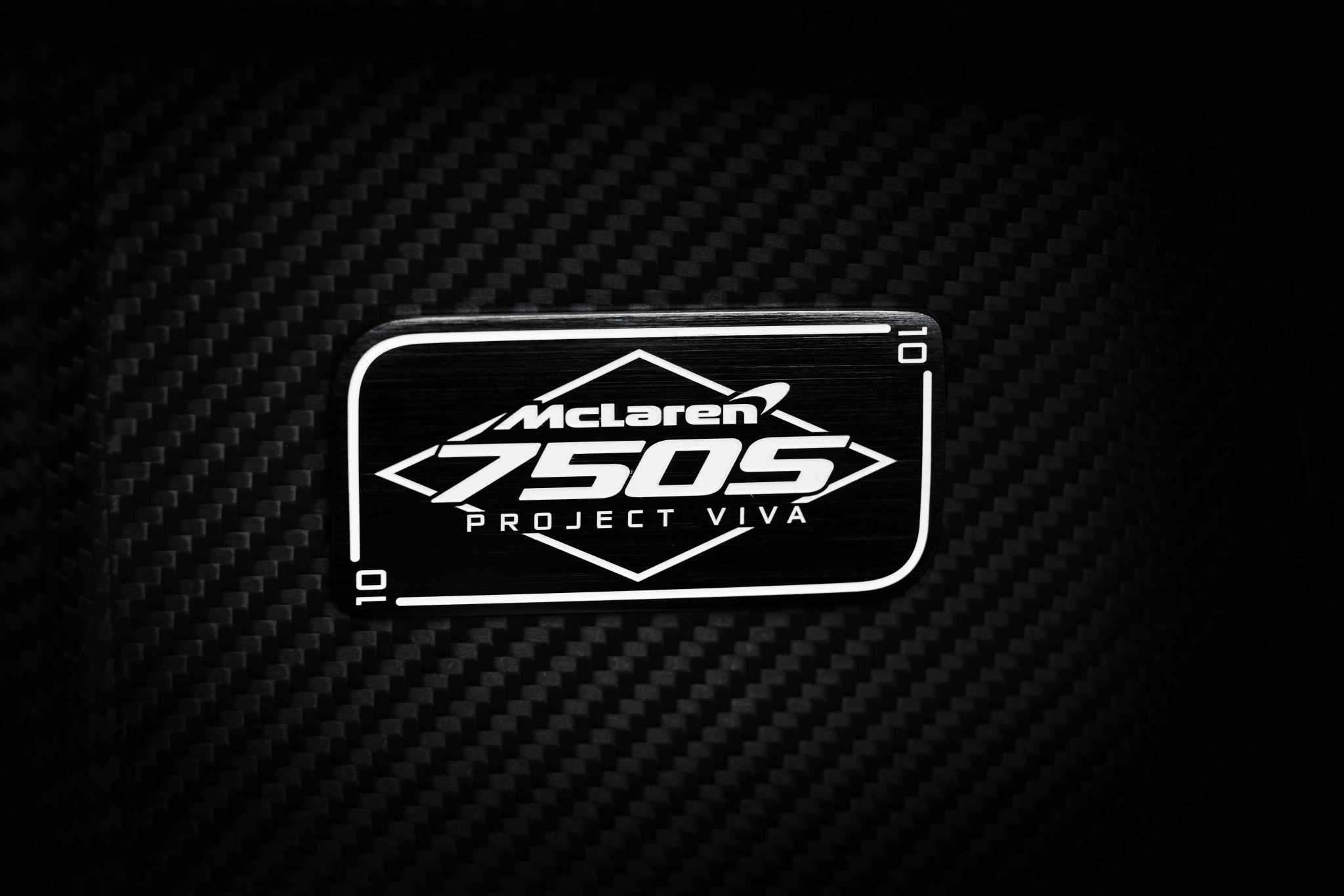 A metallic badge reading "McLaren 750S Project Viva" is mounted on a carbon fiber background, celebrating the unique spirit of Project Viva Revealed: One-of-One McLaren 750S Spider Brings Las Vegas to Life.