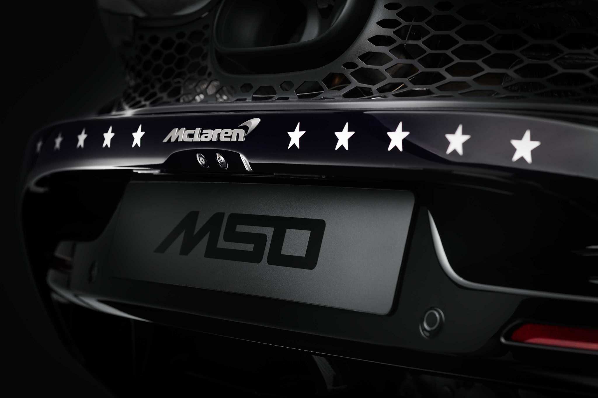 Close-up of a McLaren car's rear with the McLaren logo, star decals, and "MSO" text on the license plate area—Project Viva Revealed: One-of-One McLaren 750S Spider Brings Las Vegas to Life.