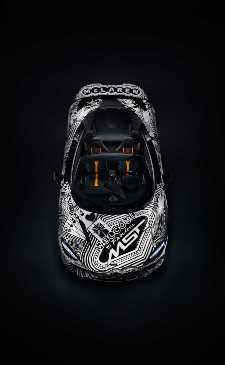 Overhead view of the Project Viva Revealed: One-of-One McLaren 750S Spider with black and white abstract graphics and orange seat accents, displayed against a black background—bringing Las Vegas to life in striking style.