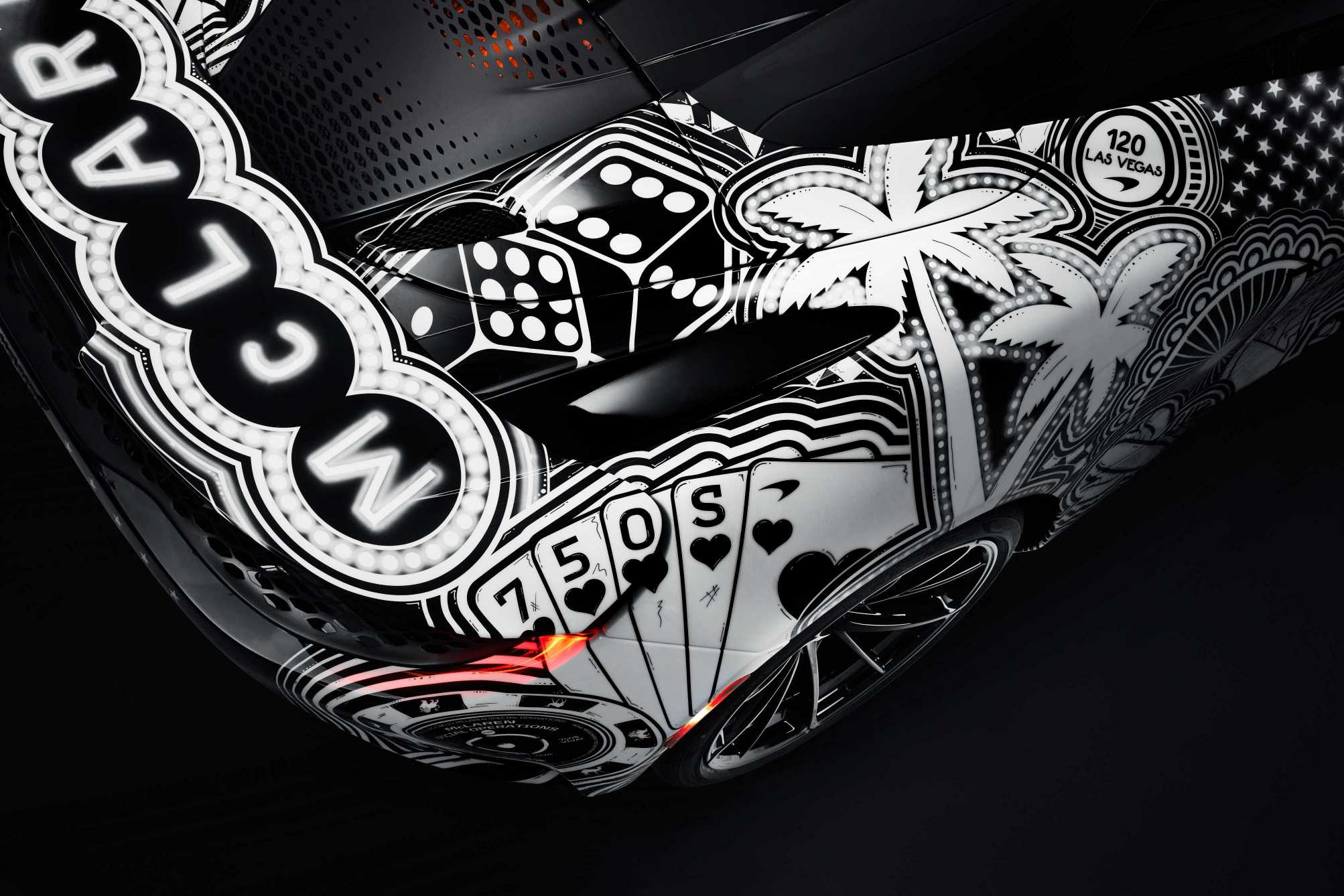 A close-up of a one-of-one McLaren 750S Spider from Project Viva Revealed, adorned with black and white Las Vegas-themed graphics—dice, palm trees, playing cards, and the number 150—with the red taillight illuminated.