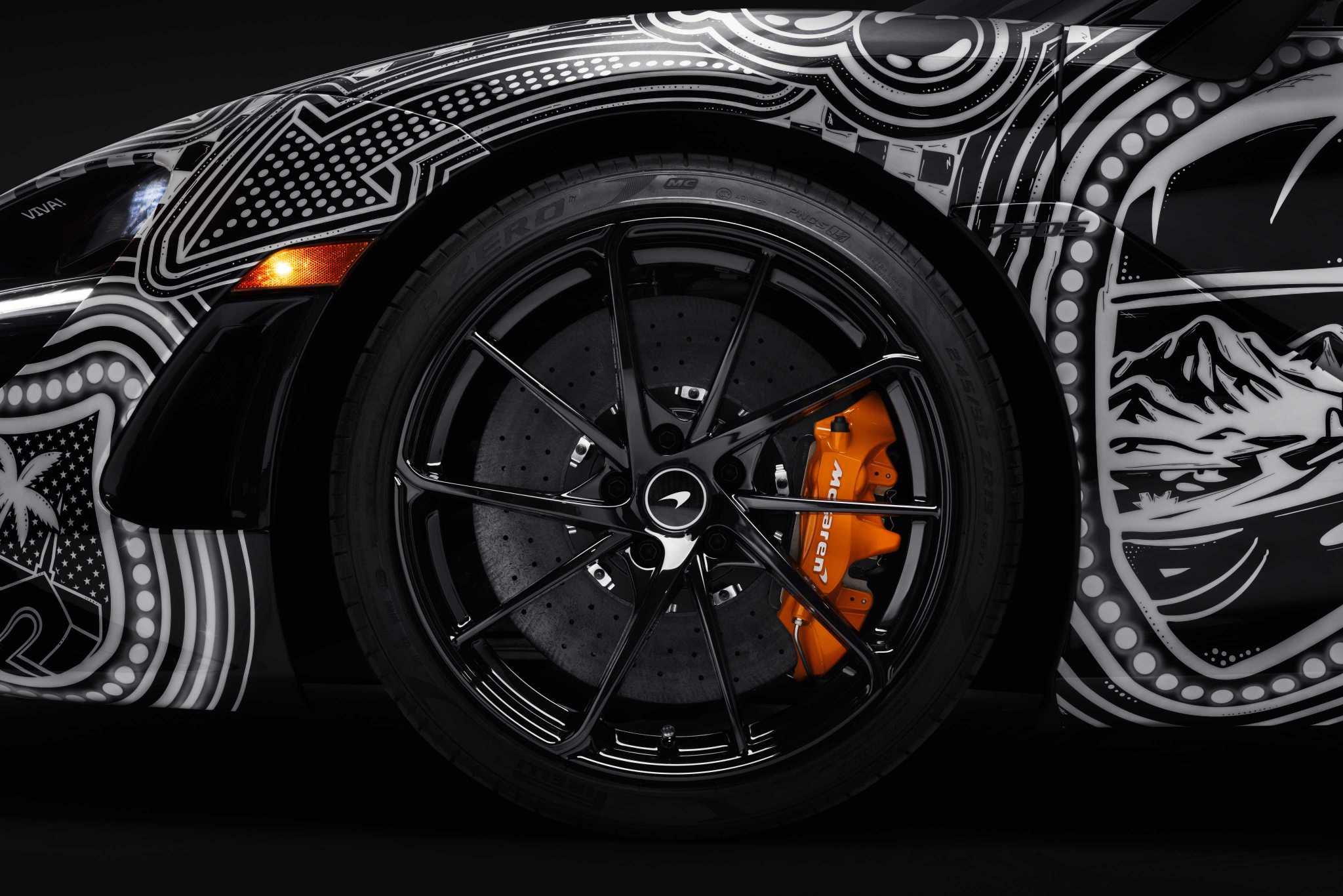 Close-up of a sports car's front wheel with black alloy rims, orange brake caliper, and artistic black-and-white graphic wrap—Project Viva Revealed: One-of-One McLaren 750S Spider Brings Las Vegas to Life in bold detail.