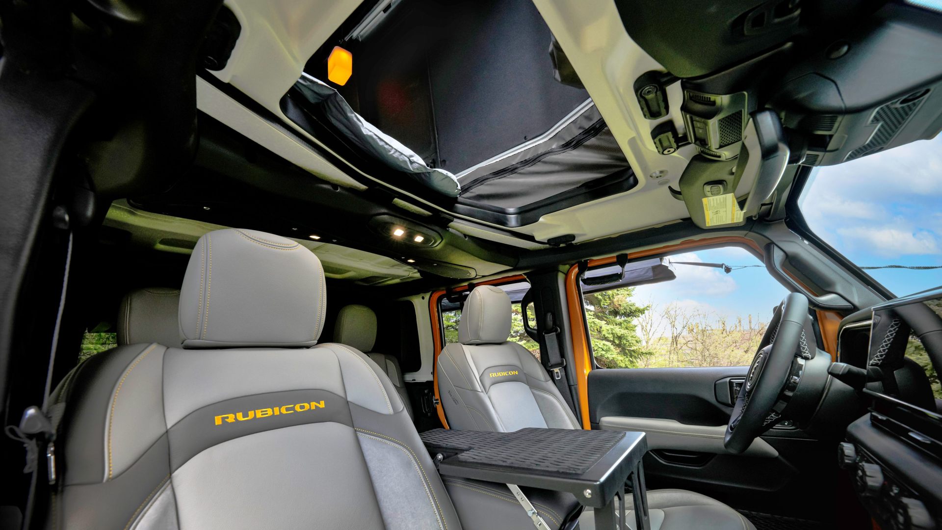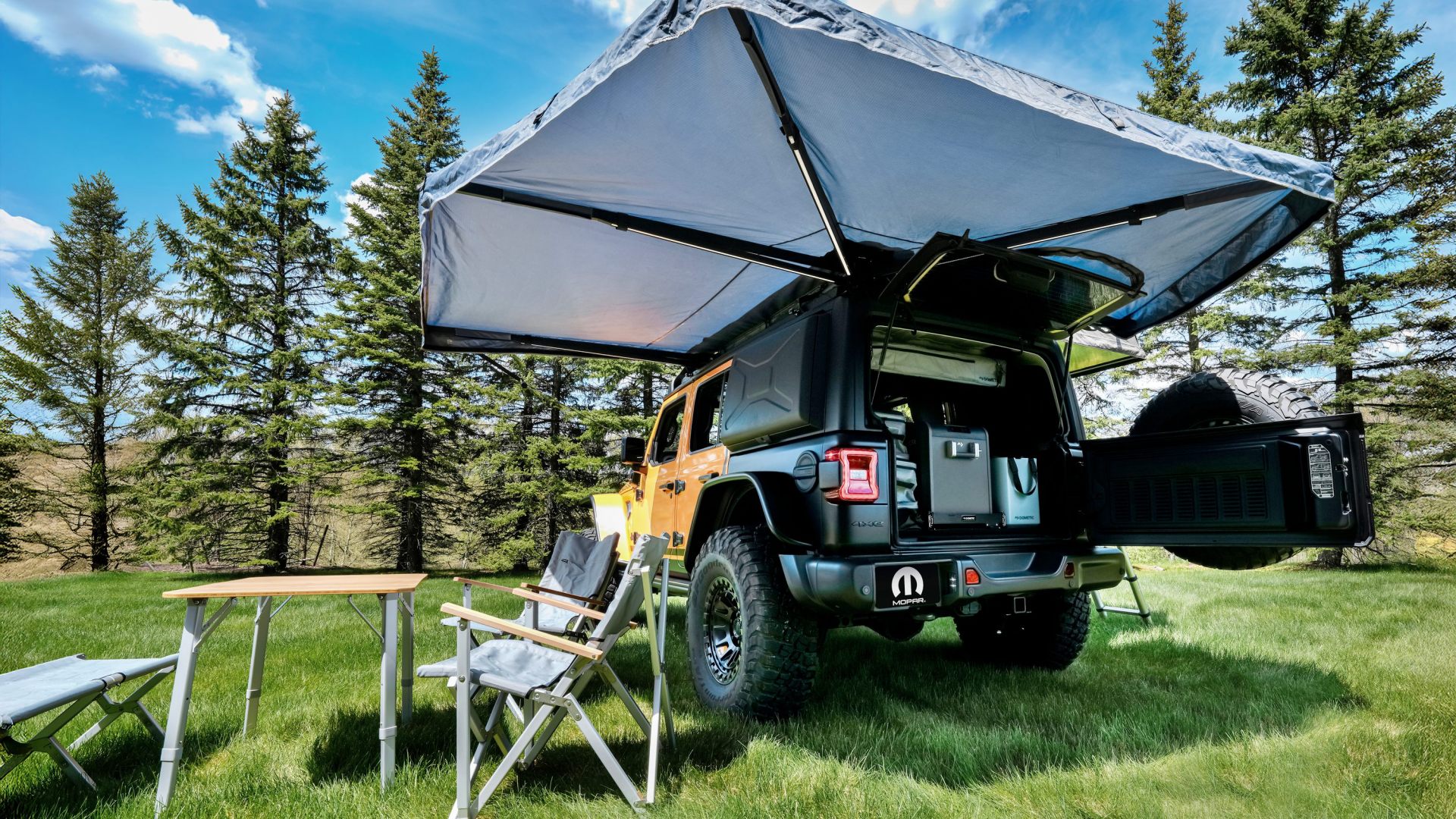 Neatly tucked away inside the shell is a rooftop tent that makes use of Dometic’s AIR Frame inflation tech, making it a breeze to deploy and providing enough room for a queen-size mattress. An awning that swings out 270 degrees provides ample cover for when you’re out and about in the elements. Speaking of the elements, if you’ve never been a fan of an external ladder (you still have that option here), Jeep has engineered a workaround: remove the Wrangler’s Freedom Panels, and you can crawl up into the tent right from within the cabin, with the help of a carbon-fiber step that sits over the center-console.